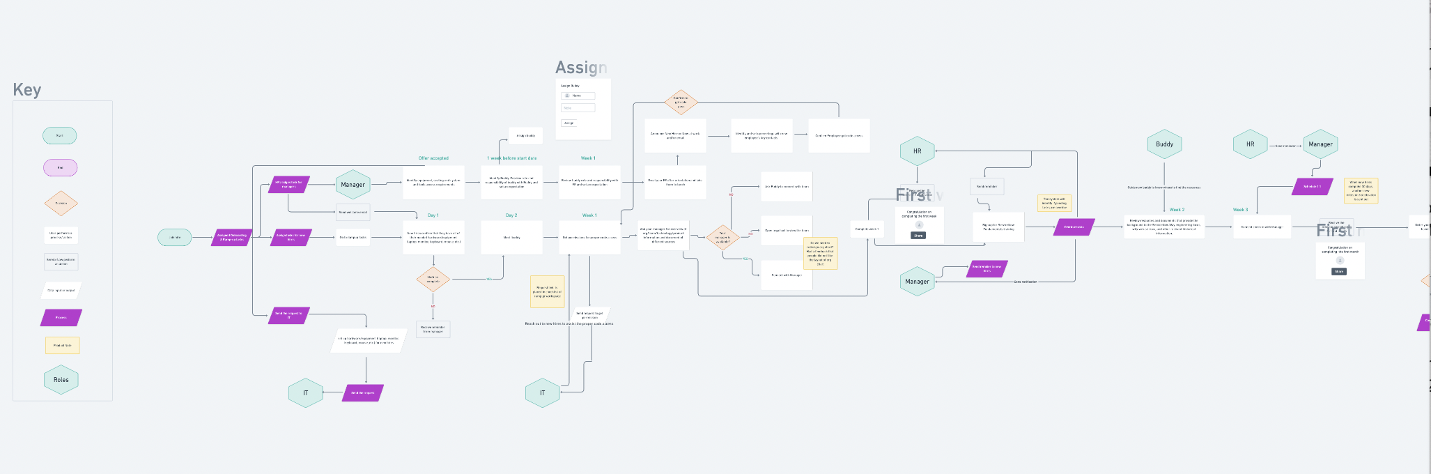 After identifying the checklist provided by HR, we conducted a brainstorming session to outline the 90-day activities of new hires, HR, and managers. This helped us ensure that all necessary steps were designed for a smooth flow of communication among departments.