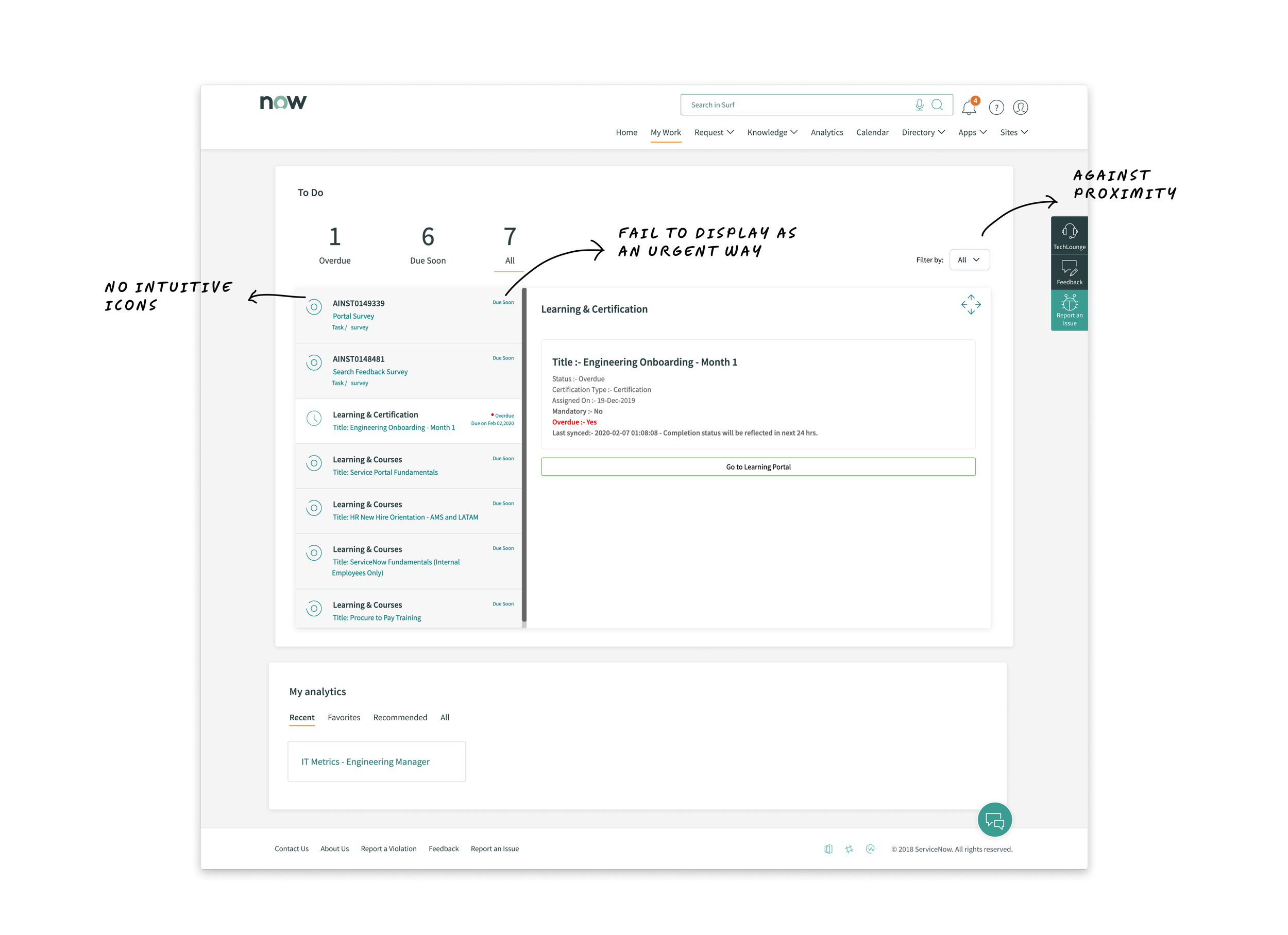 We gathered numerous pain points from new hires, most of which occurred within the first 60 days. They often felt overwhelmed by the multitude of tasks and were eager to learn more about ServiceNow products, yet they struggled with prioritizing where to start.
