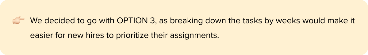OPTION 3: New hires struggled with task prioritization, so we discussed an alternative approach: organizing the tasks by weeks.