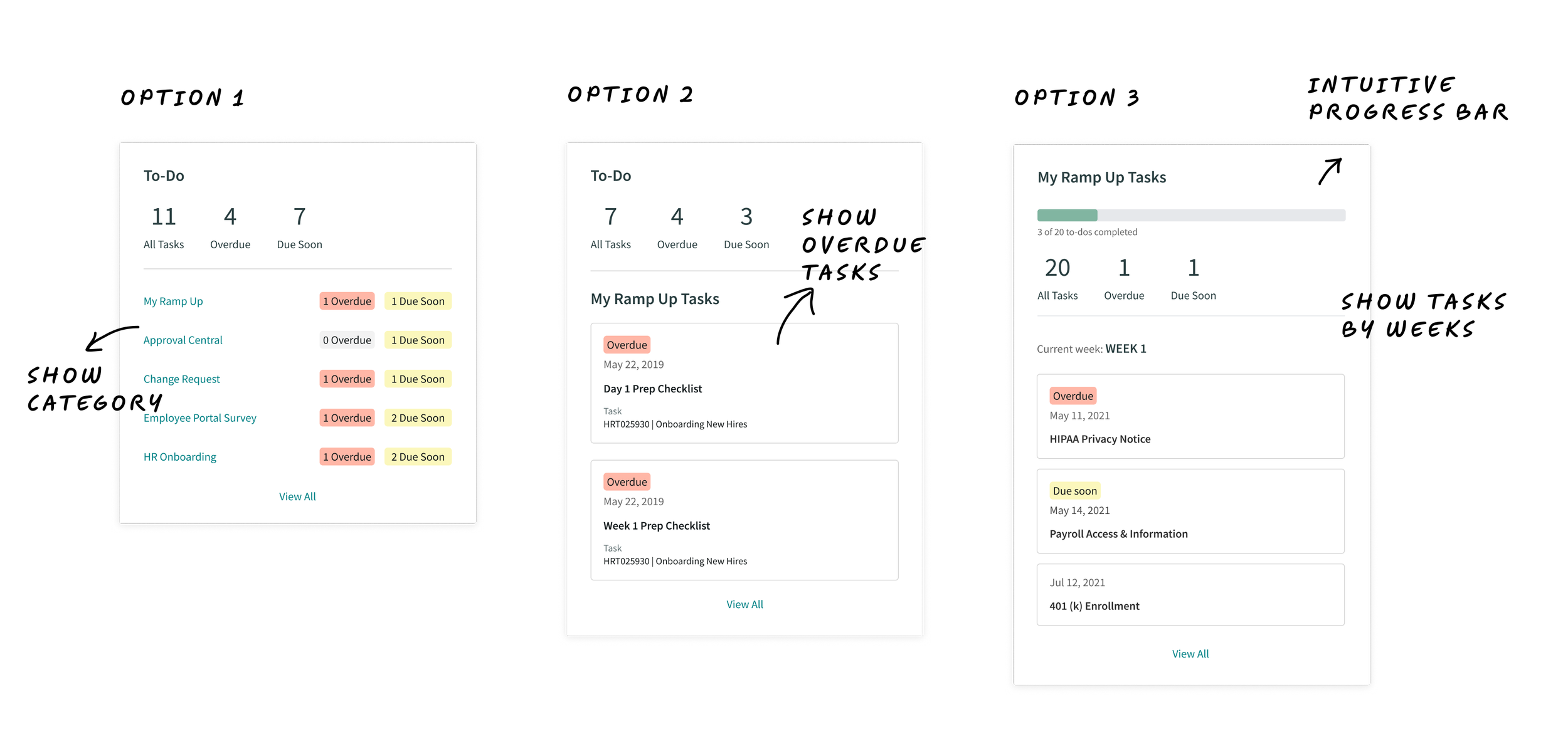 OPTION 2: present the most recently overdue tasks. While this approach doesn't offer employees a view of the overall task categories, it does empower them to address overdue and due soon tasks promptly.