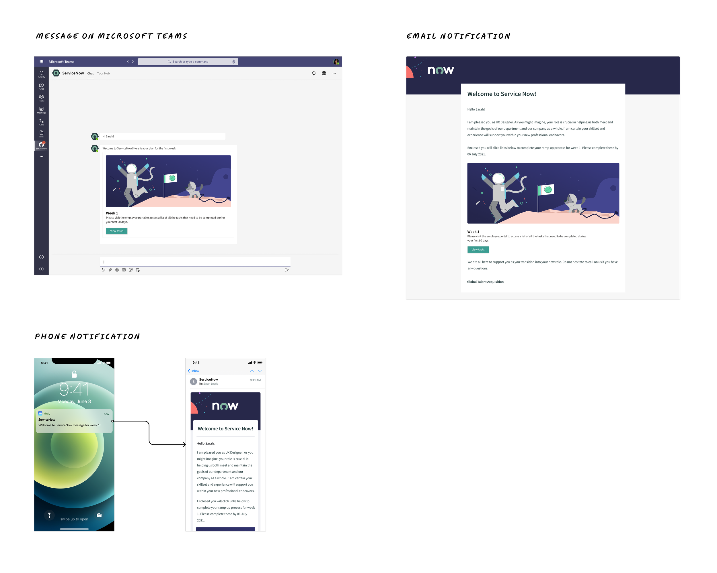 To increase engagement among new hires, we expanded our notification strategy to include multiple platforms such as Teams, Email, and Phone notifications. Consequently, we also needed to design templates for the development team to use when sending out these notifications.