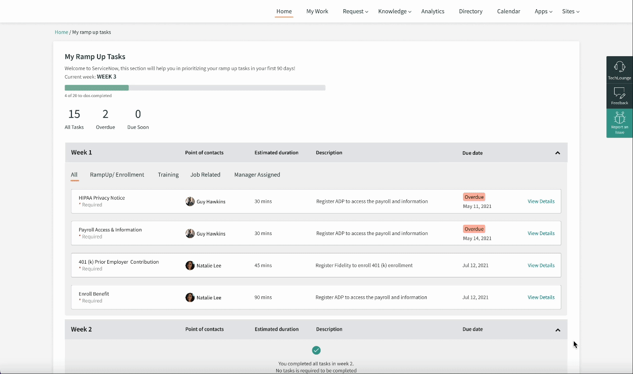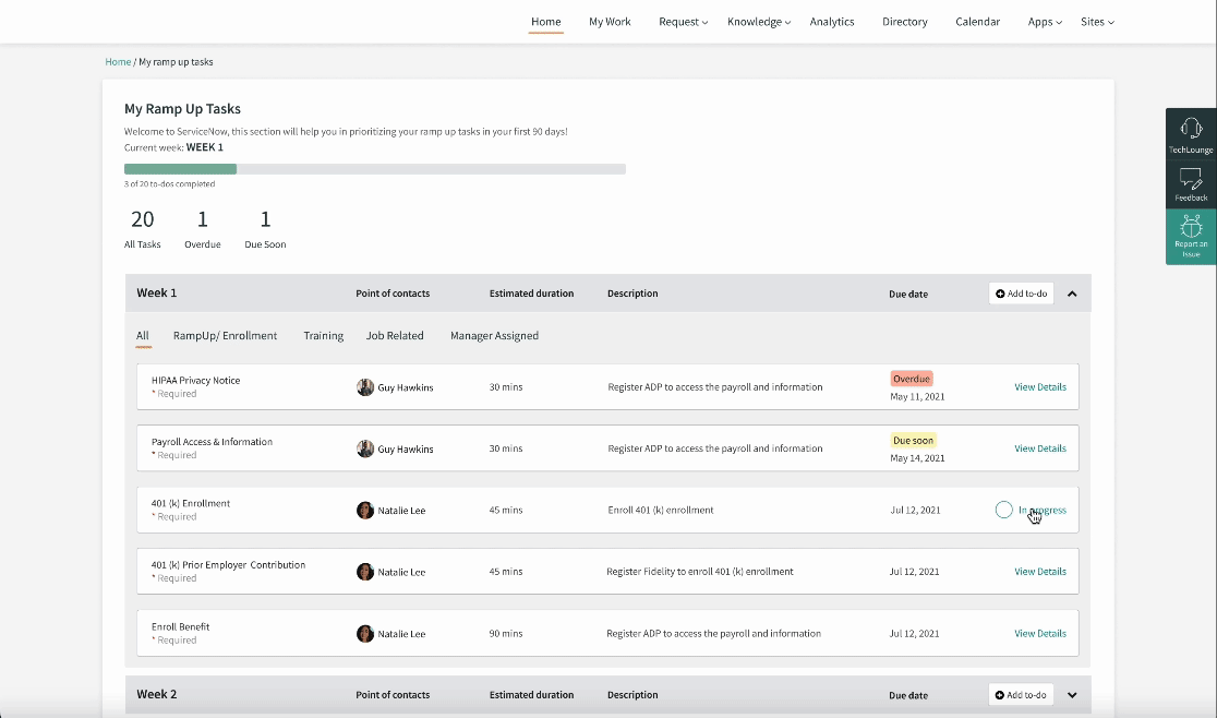 New hires log into the employee portal to view their weekly tasks widget. They can click "View all" to access the complete ramp-up task list and complete them according to the schedule.