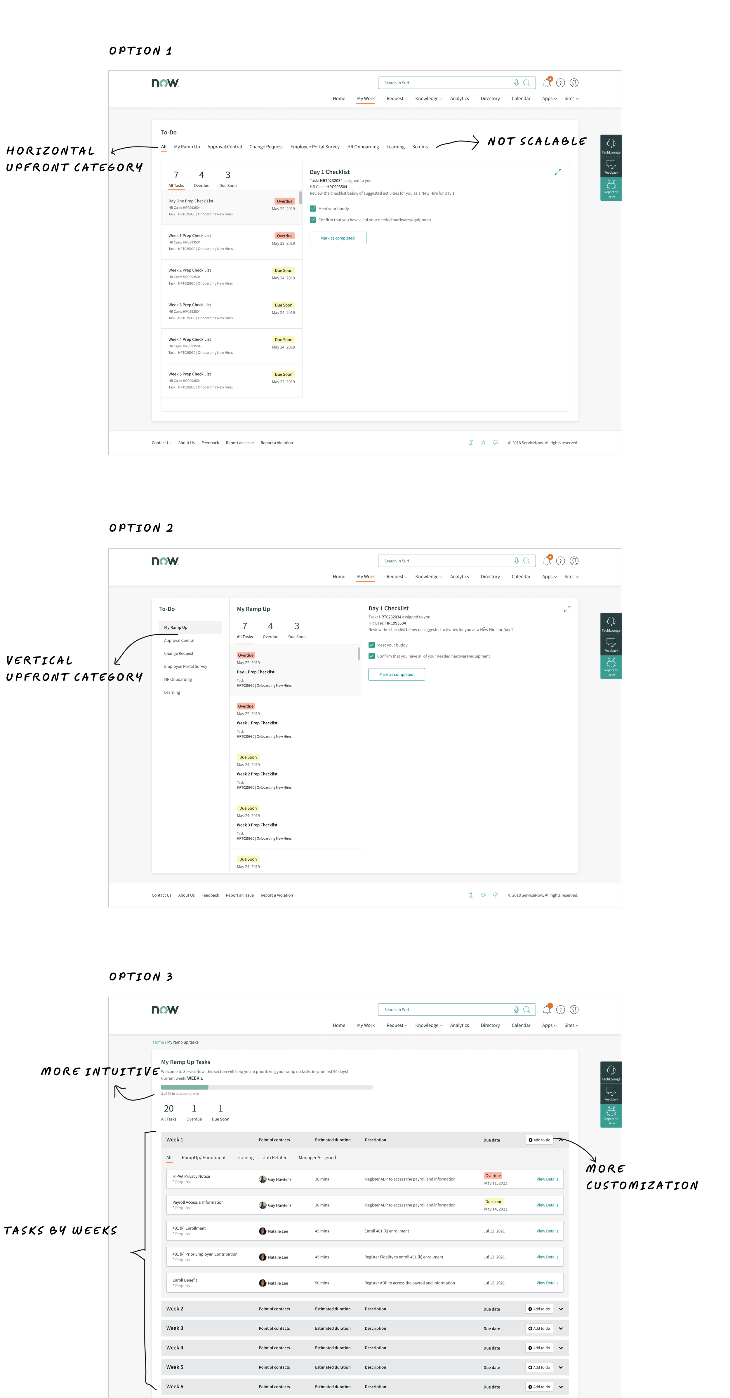 Additionally, for the MVP, we decided not to introduce too many complex designs due to technical constraints on the ServiceNow platform and the limited timeline. However, we wanted to keep the ramp-up experience separate from other tasks. To achieve this, we used the same 'Todo' cards and placed them side by side when additional tasks emerged.